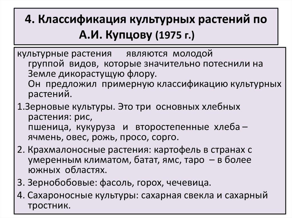 4. Классификация культурных растений поА.И. Купцову (1975 г.)