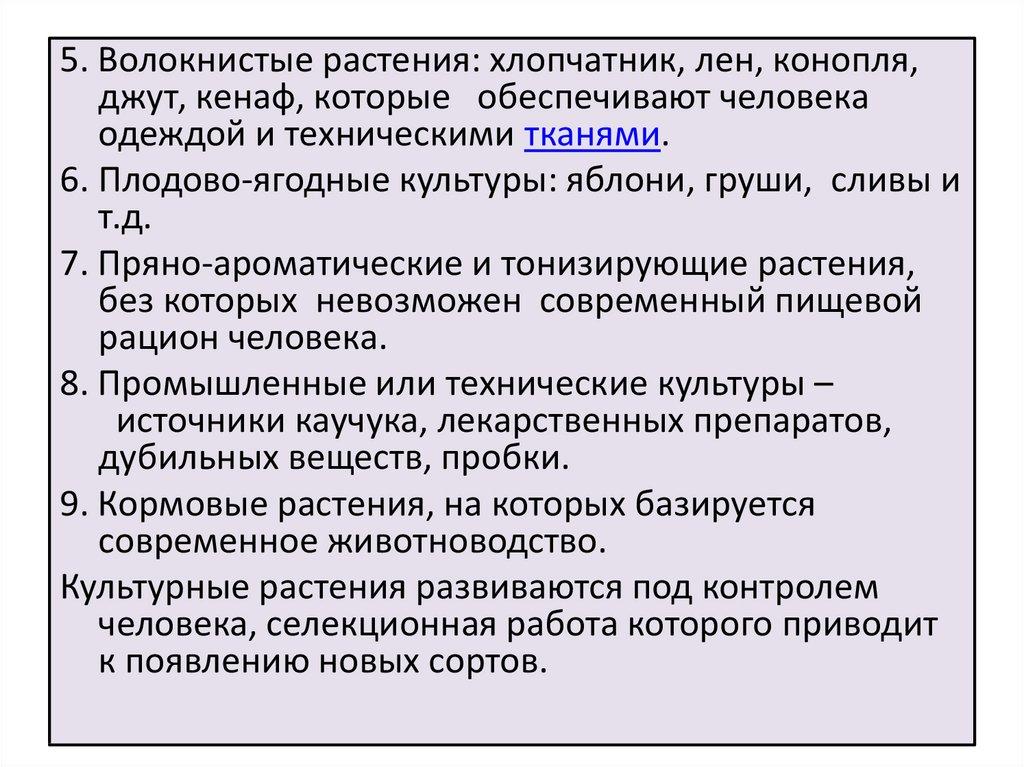 5. Волокнистые растения: хлопчатник, лен, конопля,джут, кенаф, которые обеспечивают человека