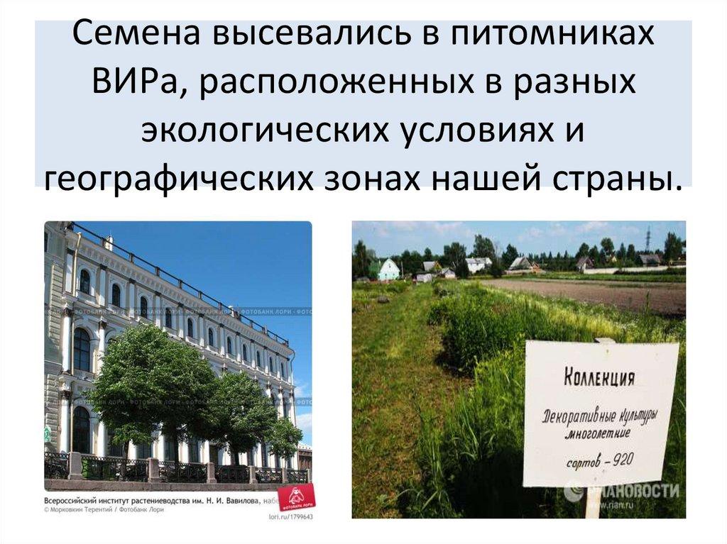 9. Семена высевались в питомниках ВИРа, расположенных в разных экологических условиях и географических зонах нашей страны.