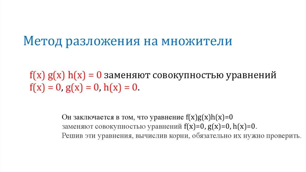 Метод разложения на множителиf(x) g(x) h(x) = 0 заменяют совокупностью уравнений