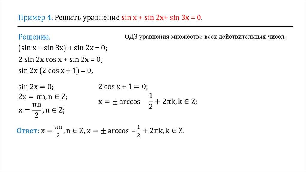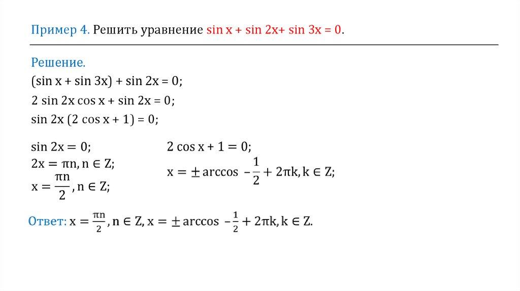 Пример 4. Решить уравнение sin х + sin 2х+ sin 3х = 0.Решение.