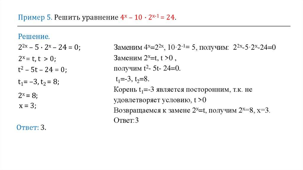 Пример 5. Решить уравнение 4х – 10 · 2х-1 = 24.Решение.