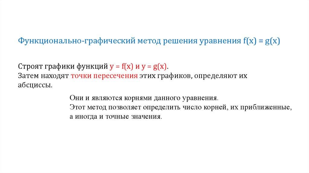 Функционально-графический метод решения уравнения f(х) = g(х)Cтроят графики функций у = f(х) и у = g(х).