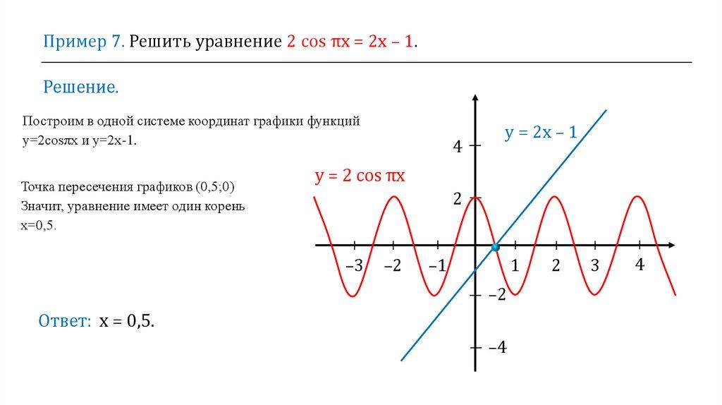 Пример 7. Решить уравнение 2 cos πх = 2х – 1.Решение.