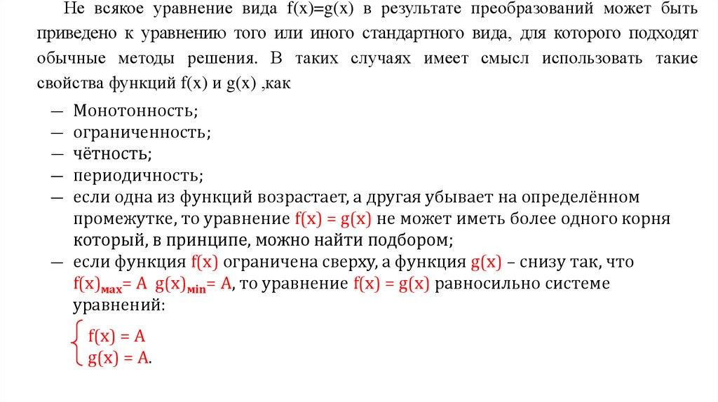 Не всякое уравнение вида f(x)=g(x) в результате преобразований может бытьприведено к уравнению того или иного стандартного вида, для которого подходят