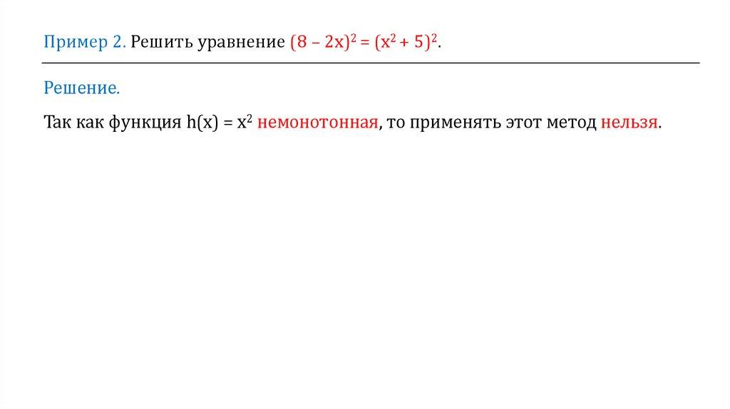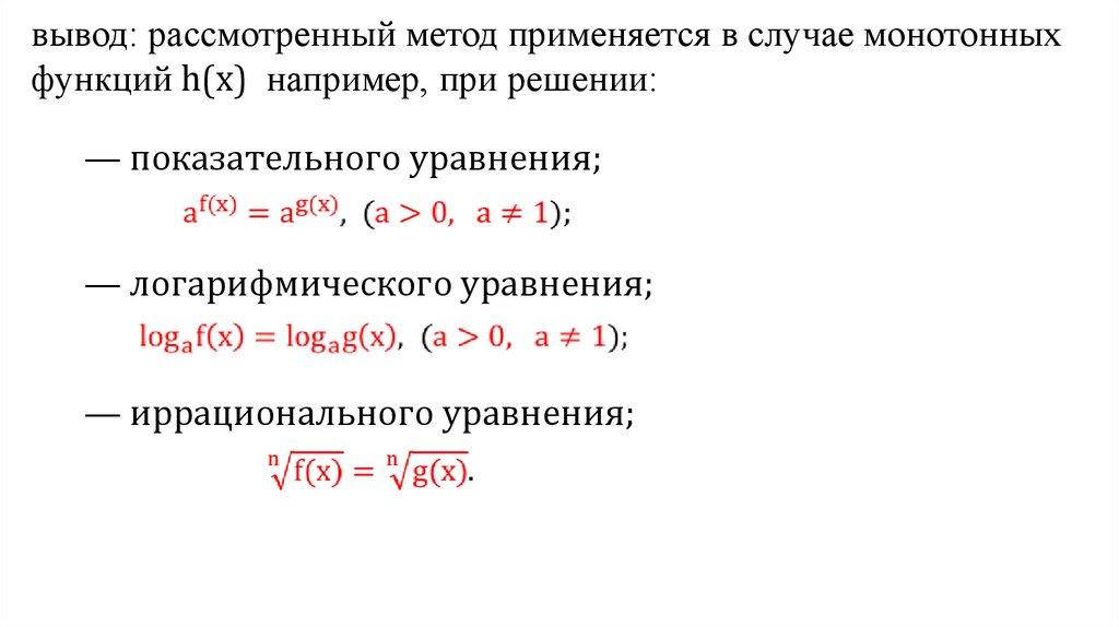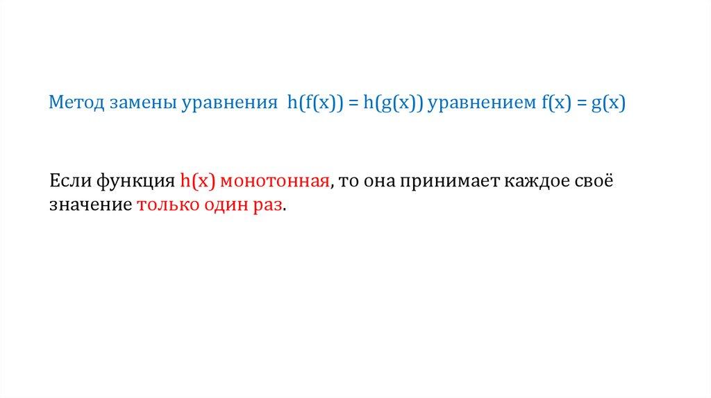 Метод замены уравнения h(f(х)) = h(g(х)) уравнением f(х) = g(х)Если функция h(х) монотонная, то она принимает каждое своё