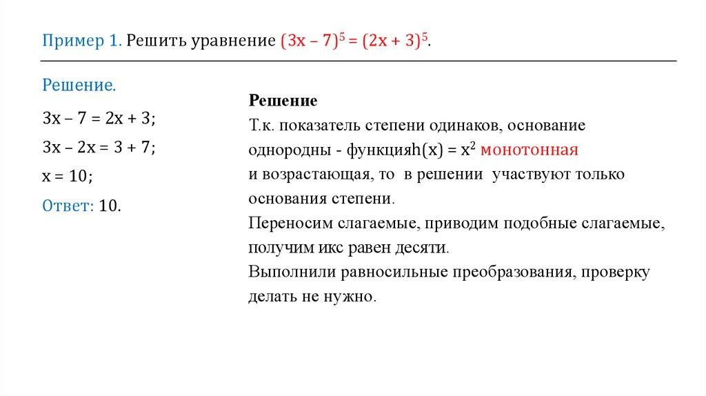 Пример 1. Решить уравнение (3х – 7)5 = (2х + 3)5.Решение.