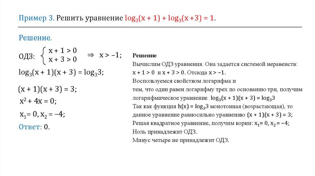 Пример 3. Решить уравнение log3(х + 1) + log3(х +3) = 1.Решение.