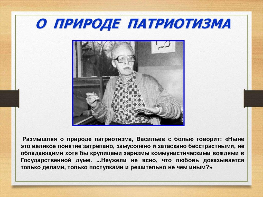 О ПРИРОДЕ ПАТРИОТИЗМАРазмышляя о природе патриотизма, Васильев с болью говорит: «Ныне