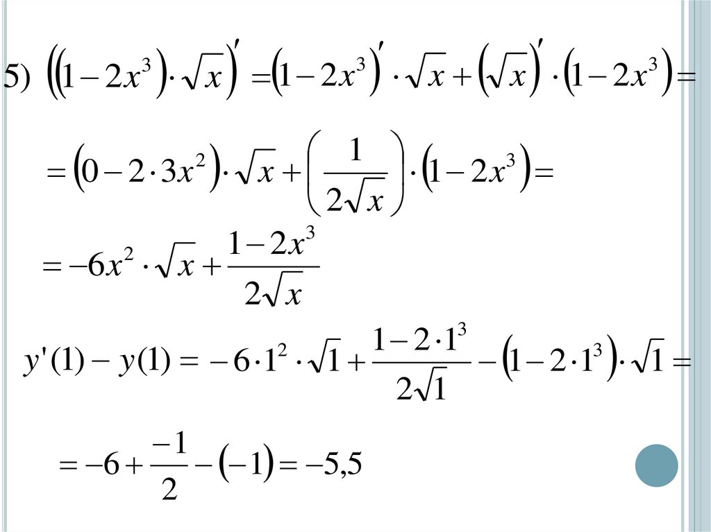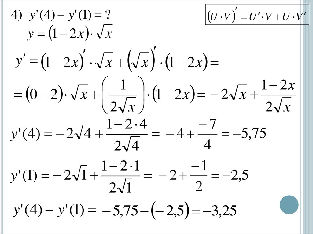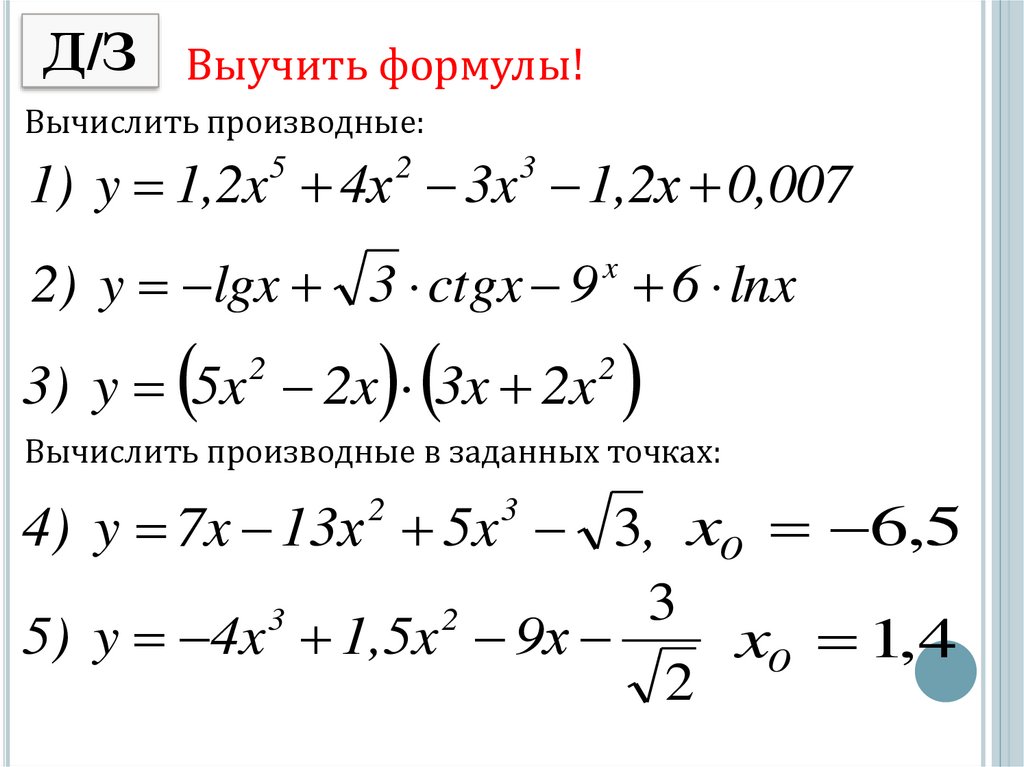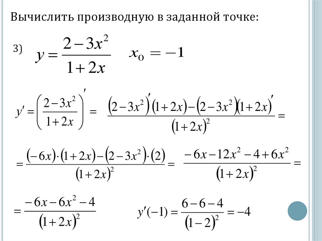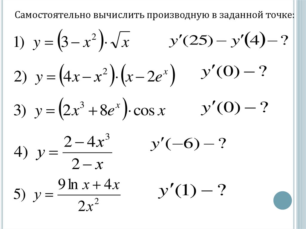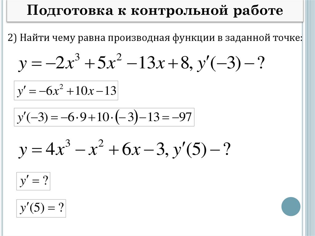 Подготовка к контрольной работе2) Найти чему равна производная функции в заданной точке: