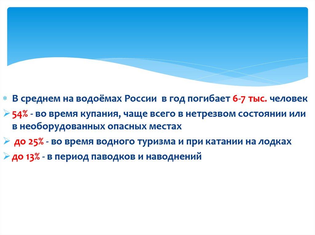 В среднем на водоёмах России в год погибает 6-7 тыс. человек54% - во время купания, чаще всего в нетрезвом состоянии или