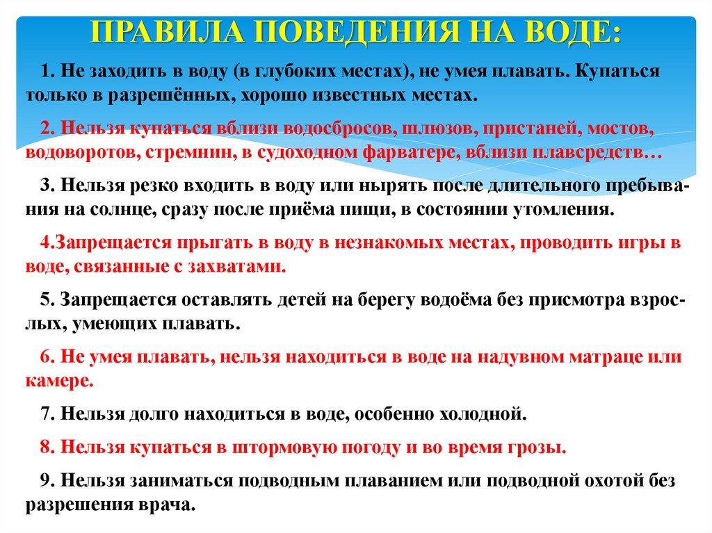 ПРАВИЛА ПОВЕДЕНИЯ НА ВОДЕ:1. Не заходить в воду (в глубоких местах), не умея плавать. Купаться