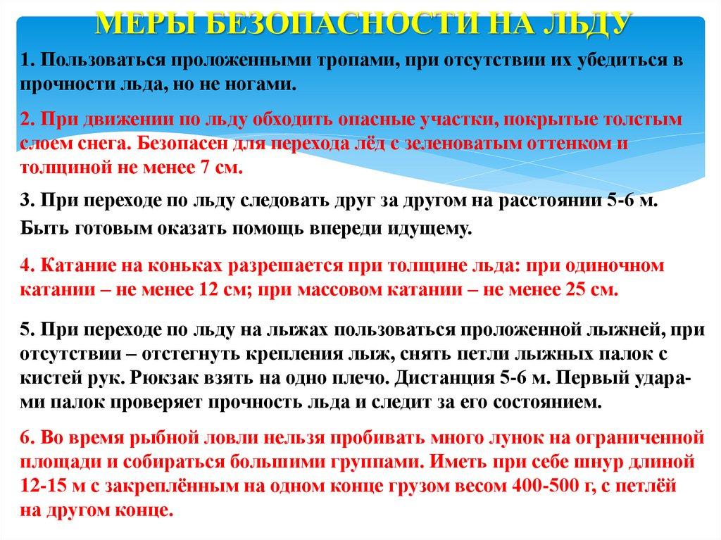 МЕРЫ БЕЗОПАСНОСТИ НА ЛЬДУ1. Пользоваться проложенными тропами, при отсутствии их убедиться в