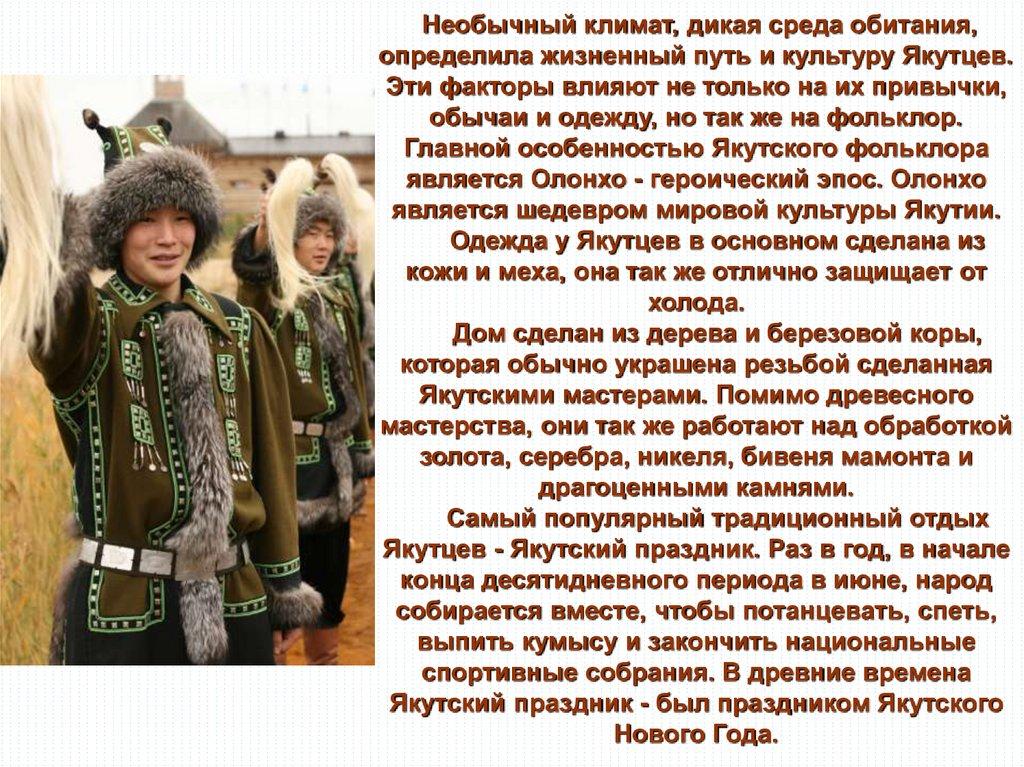 Необычный климат, дикая среда обитания,определила жизненный путь и культуру Якутцев.