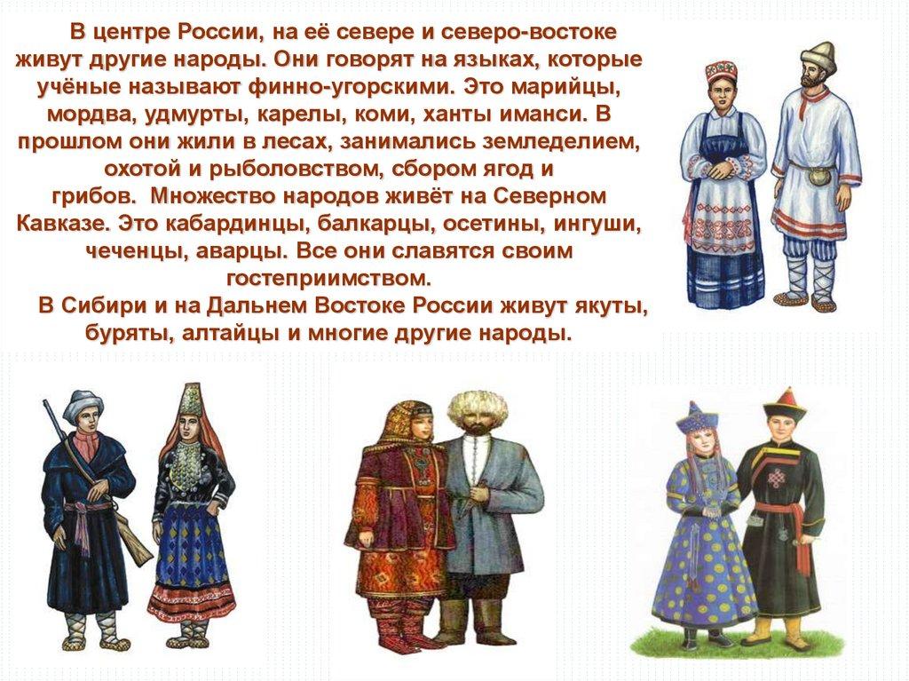 В центре России, на её севере и северо-востокеживут другие народы. Они говорят на языках, которые
