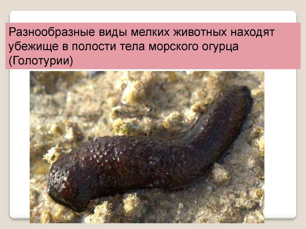 Разнообразные виды мелких животных находятубежище в полости тела морского огурца