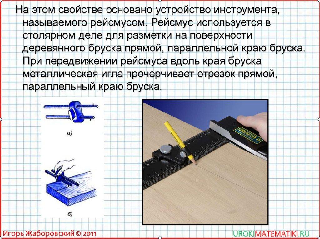 На этом свойстве основано устройство инструмента,называемого рейсмусом. Рейсмус используется в