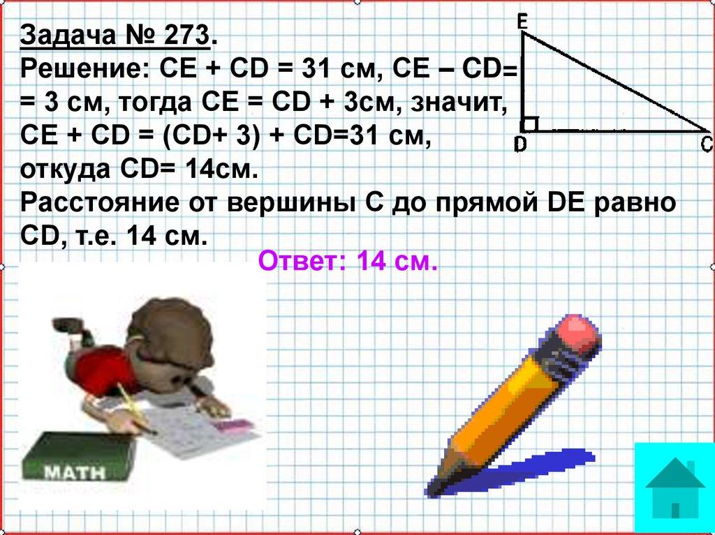 Задача № 273.Решение: СЕ + CD = 31 см, СЕ – CD=