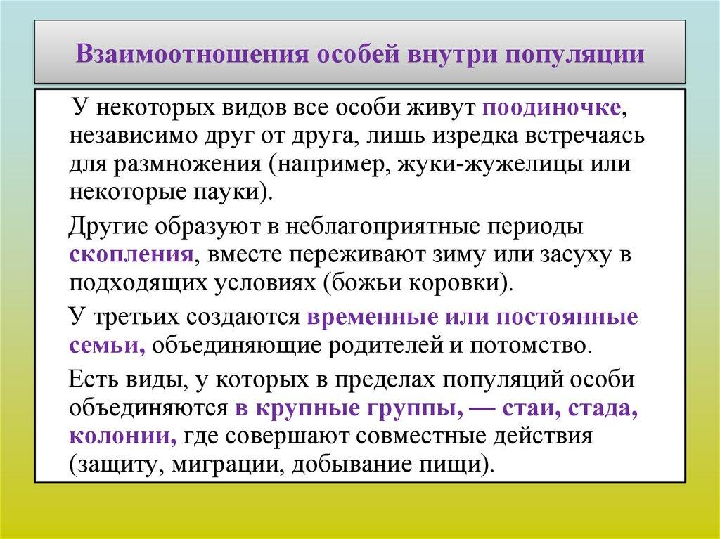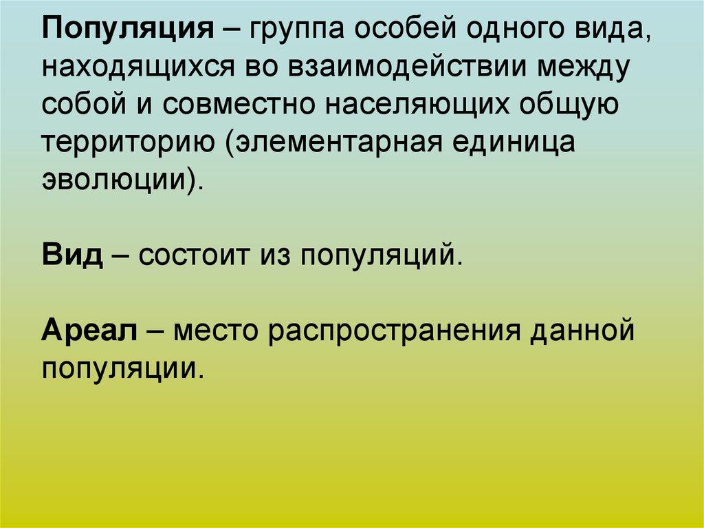 2. Популяция – группа особей одного вида, находящихся во взаимодействии между собой и совместно населяющих общую территорию