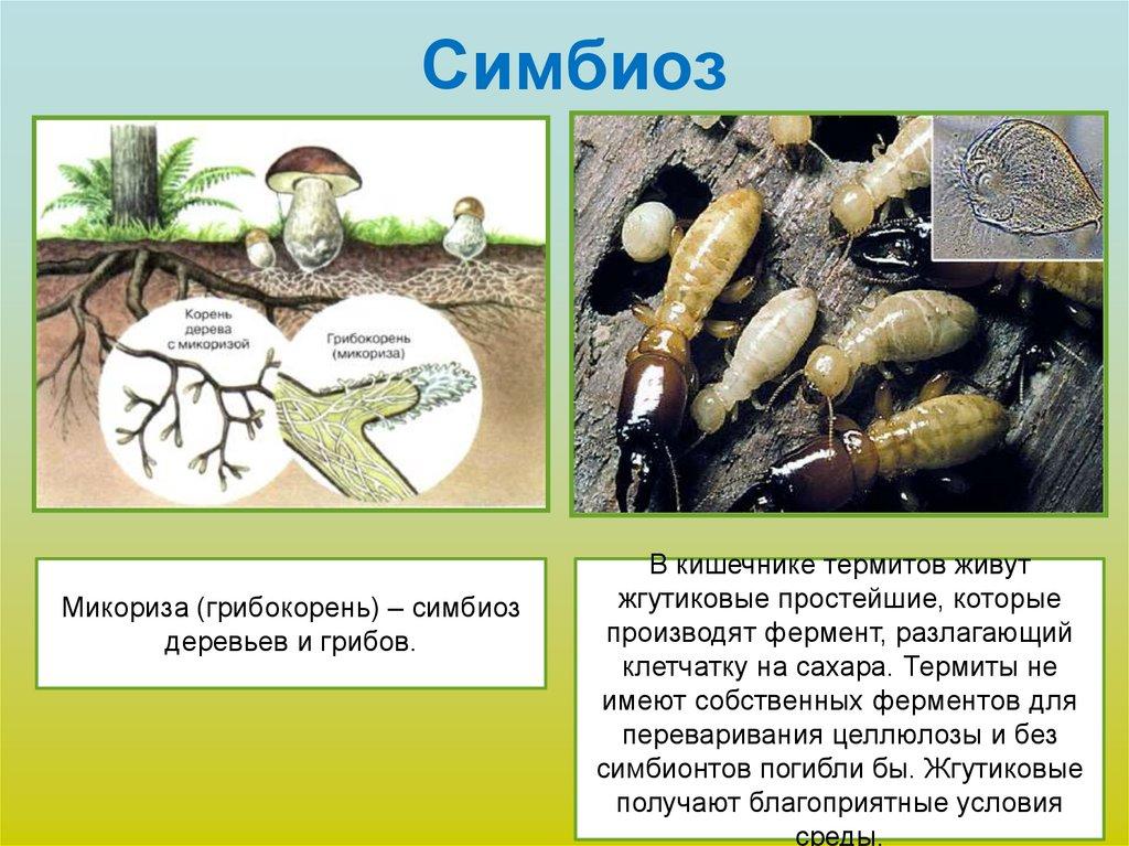 Микориза (грибокорень) – симбиоздеревьев и грибов.