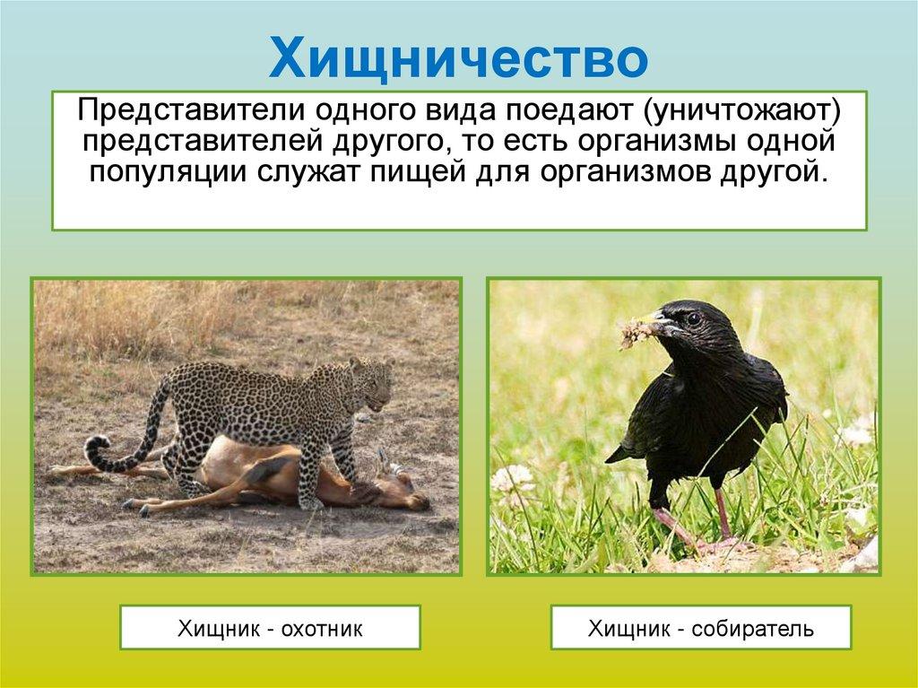 Представители одного вида поедают (уничтожают)представителей другого, то есть организмы одной