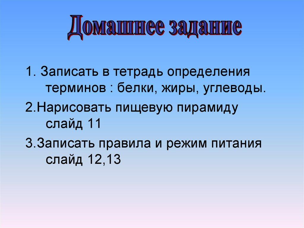 1. Записать в тетрадь определениятерминов : белки, жиры, углеводы.