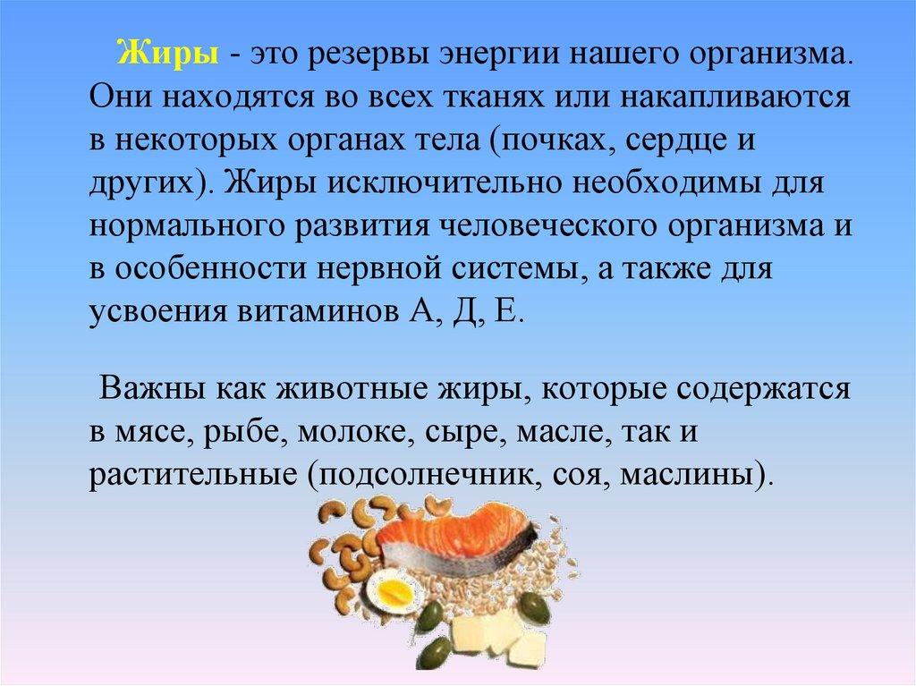 Жиры - это резервы энергии нашего организма.Они находятся во всех тканях или накапливаются