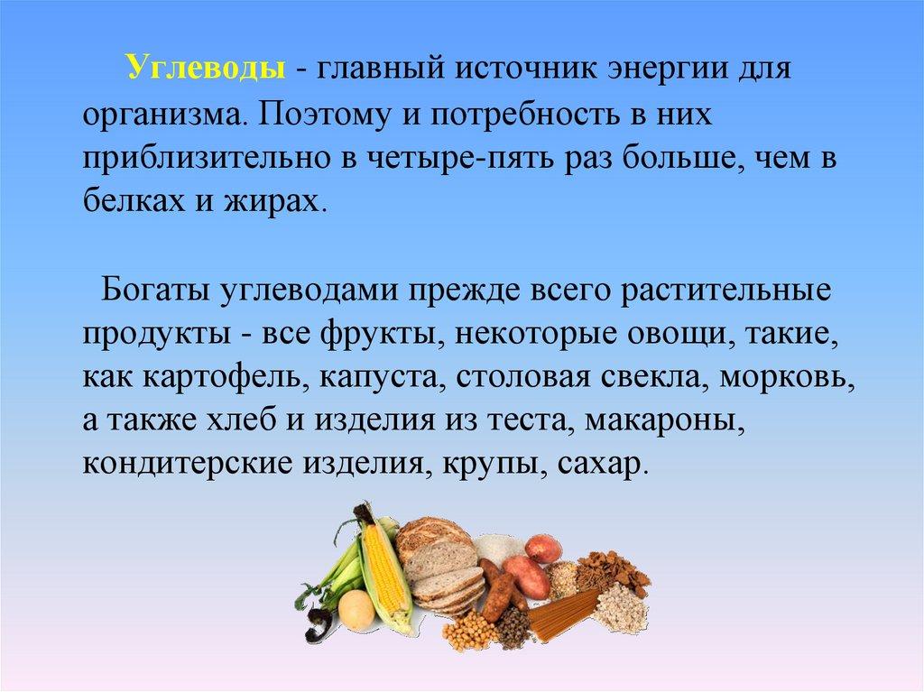 Углеводы - главный источник энергии дляорганизма. Поэтому и потребность в них