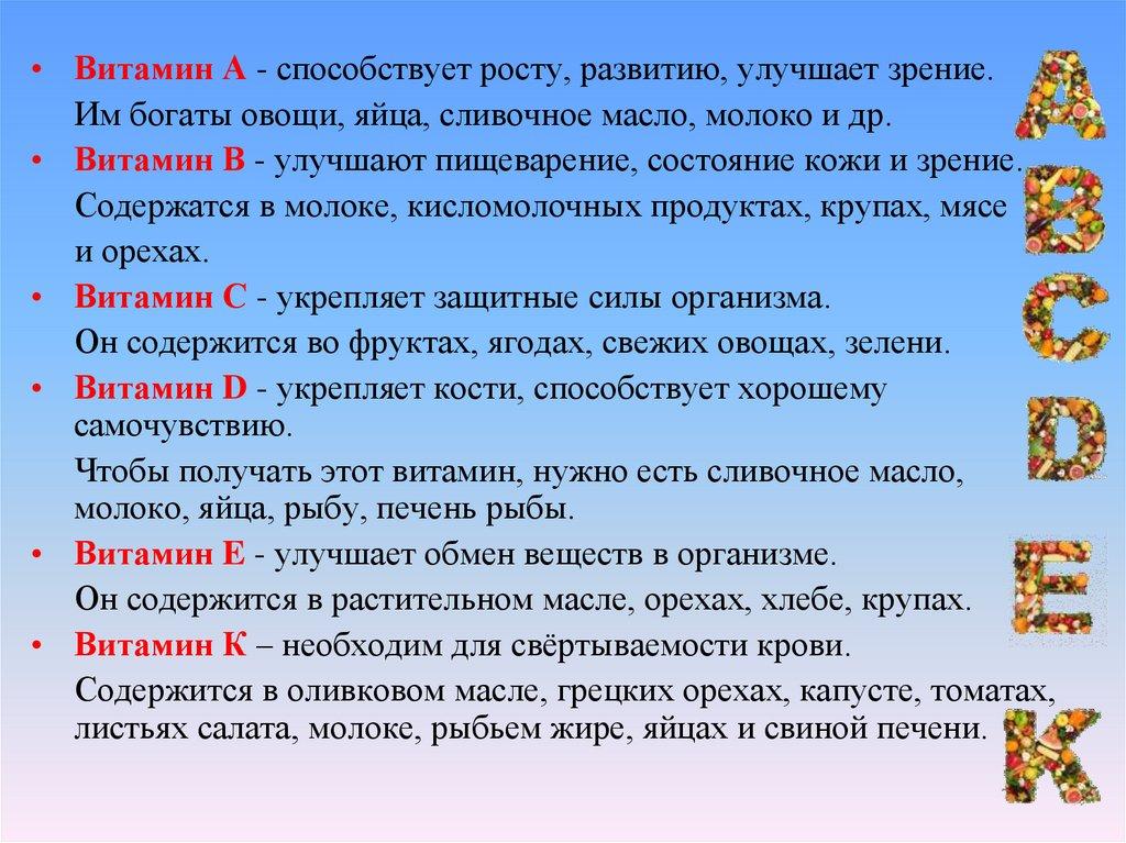 • Витамин А - способствует росту, развитию, улучшает зрение.Им богаты овощи, яйца, сливочное масло, молоко и др.