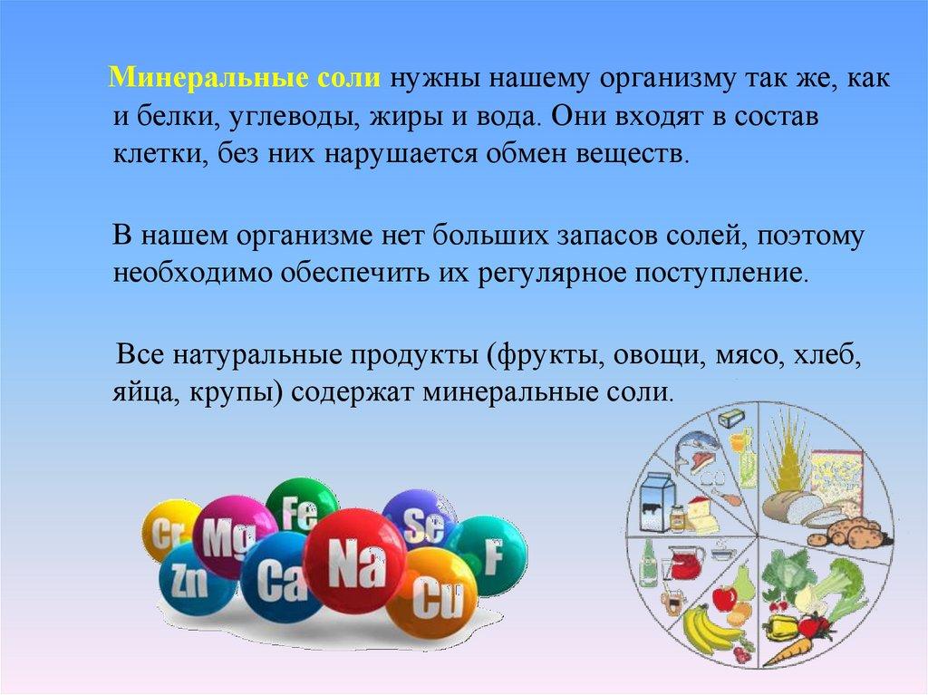 Минеральные соли нужны нашему организму так же, каки белки, углеводы, жиры и вода. Они входят в состав