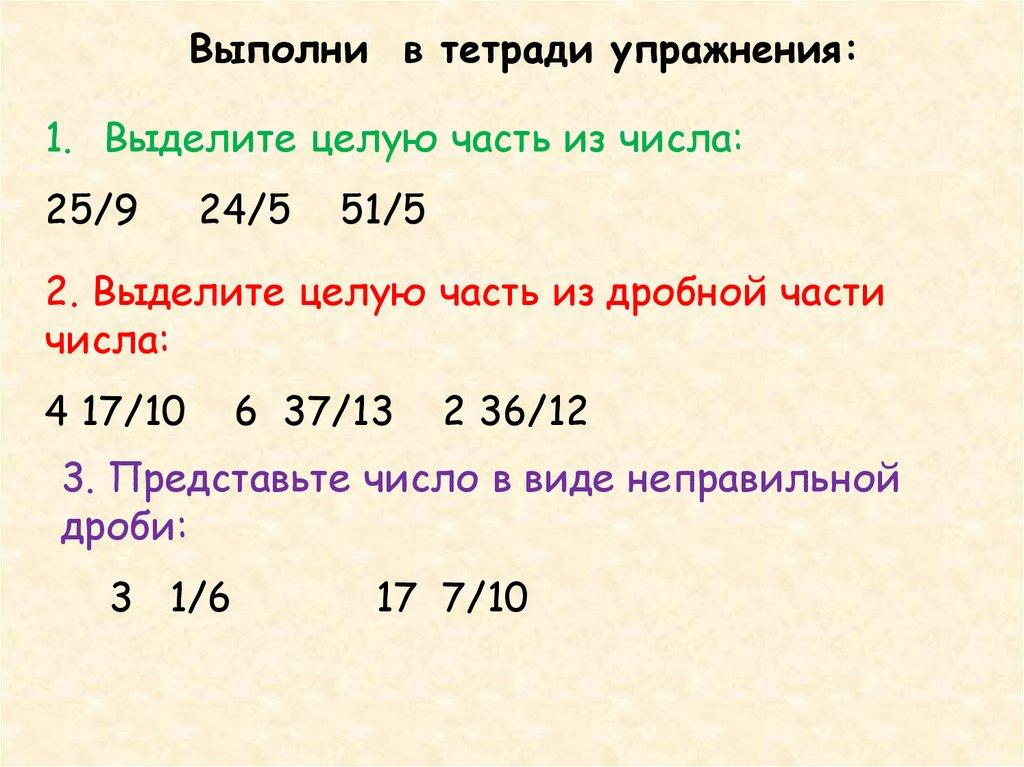 Выполни в тетради упражнения:1. Выделите целую часть из числа: