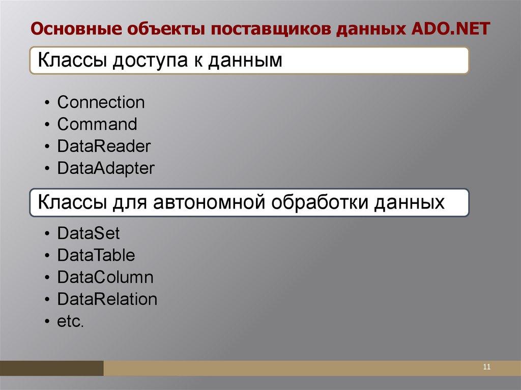 Основные объекты поставщиков данных ADO.NETКлассы доступа к данным