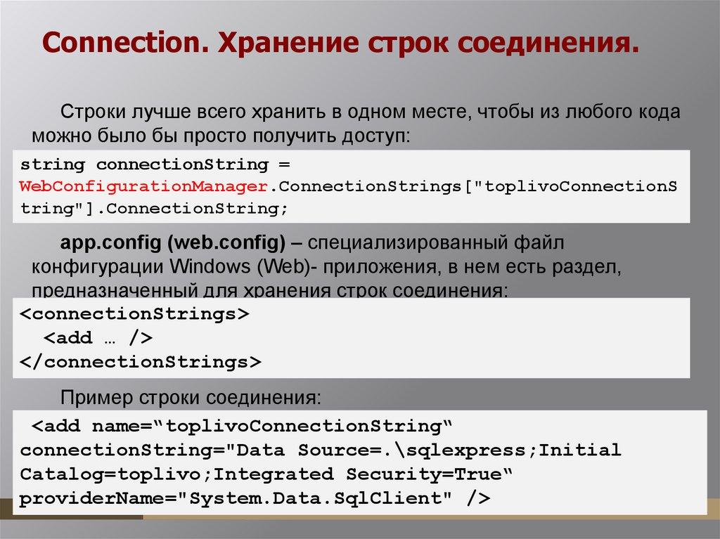 имени поставщика в формате «System.Data.ProviderName» и строки соединения.