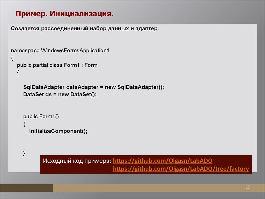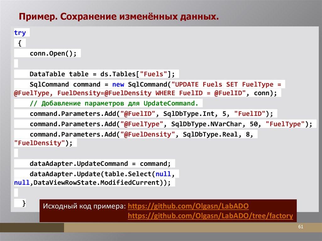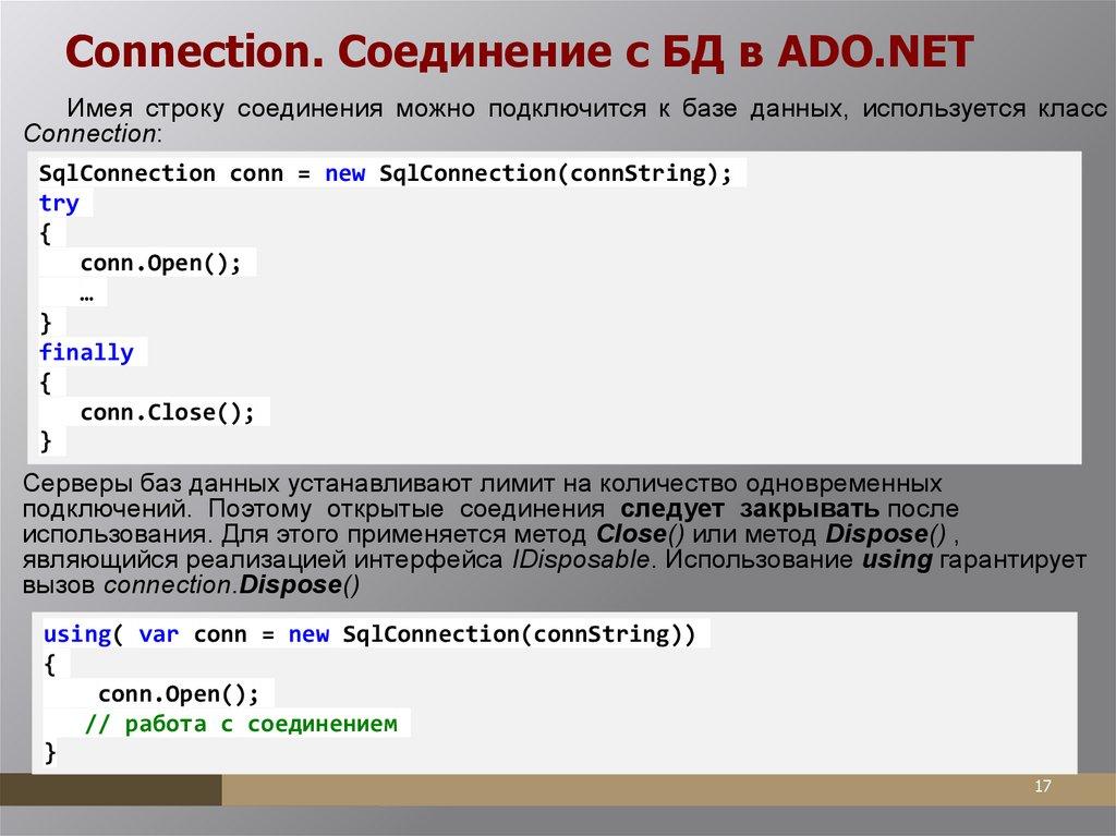 Использование фабрики (factory). ПримерDbProviderFactory factory = DbProviderFactories.GetFactory("System.Data.SqlClient");