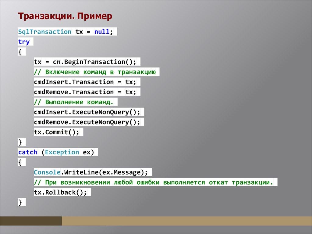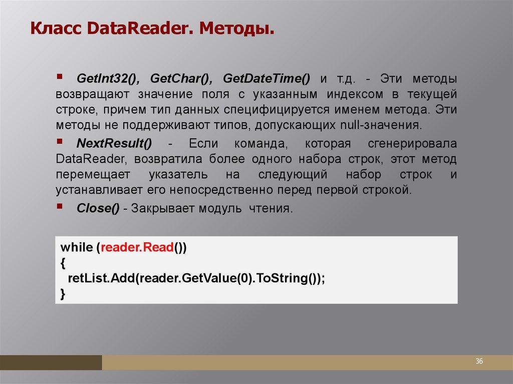 ADO.NET. Поставщики данных наследуются от этих классов (DbConnection, DbCommand и