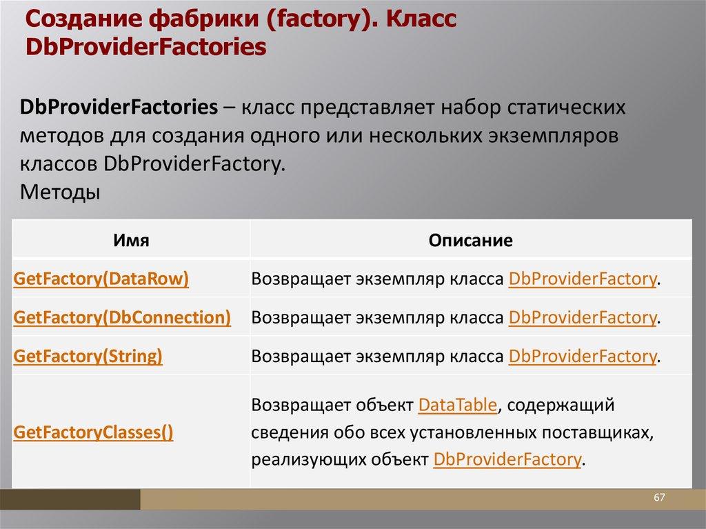 Создание фабрики (factory). КлассDbProviderFactories