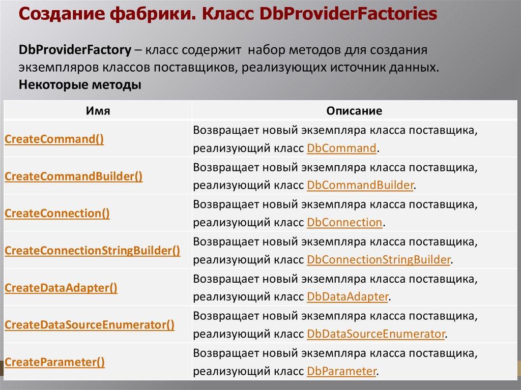 Создание фабрики. Класс DbProviderFactoriesDbProviderFactory – класс содержит набор методов для создания