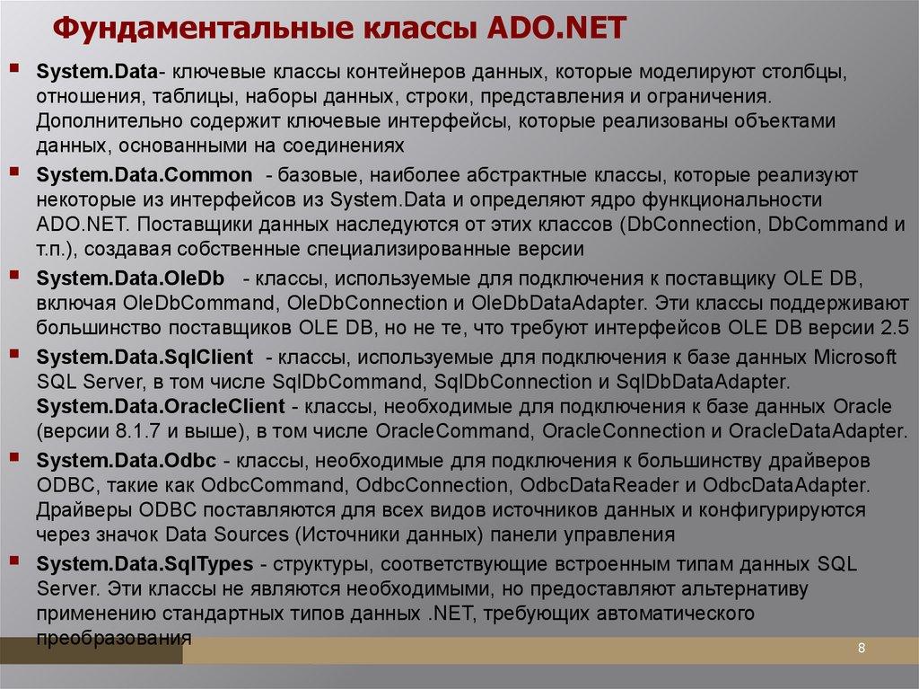 включая OleDbCommand, OleDbConnection и OleDbDataAdapter. Эти классы поддерживают