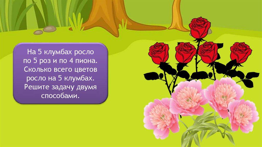 На 5 клумбах рослопо 5 роз и по 4 пиона.