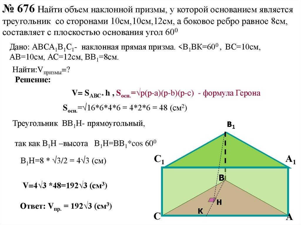 № 676 Найти объем наклонной призмы, у которой основанием являетсятреугольник со сторонами 10см,10см,12см, а боковое ребро равное 8см,