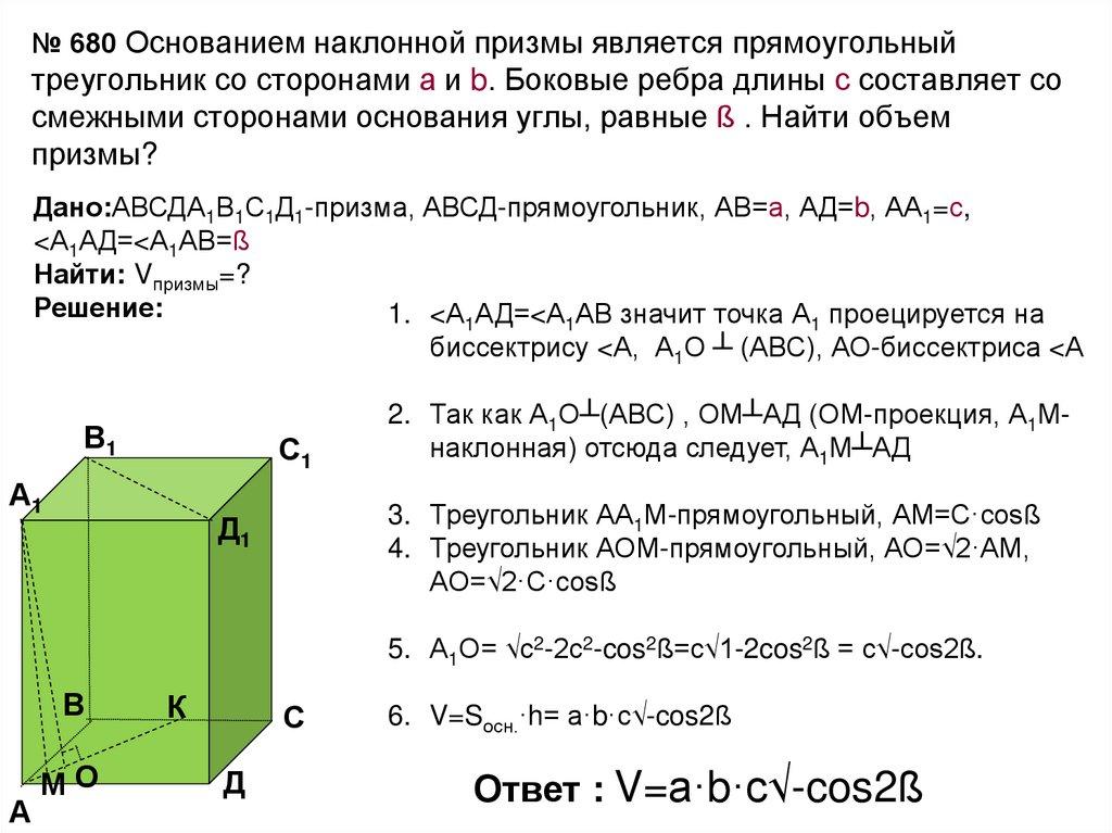 № 680 Основанием наклонной призмы является прямоугольныйтреугольник со сторонами а и b. Боковые ребра длины с составляет со