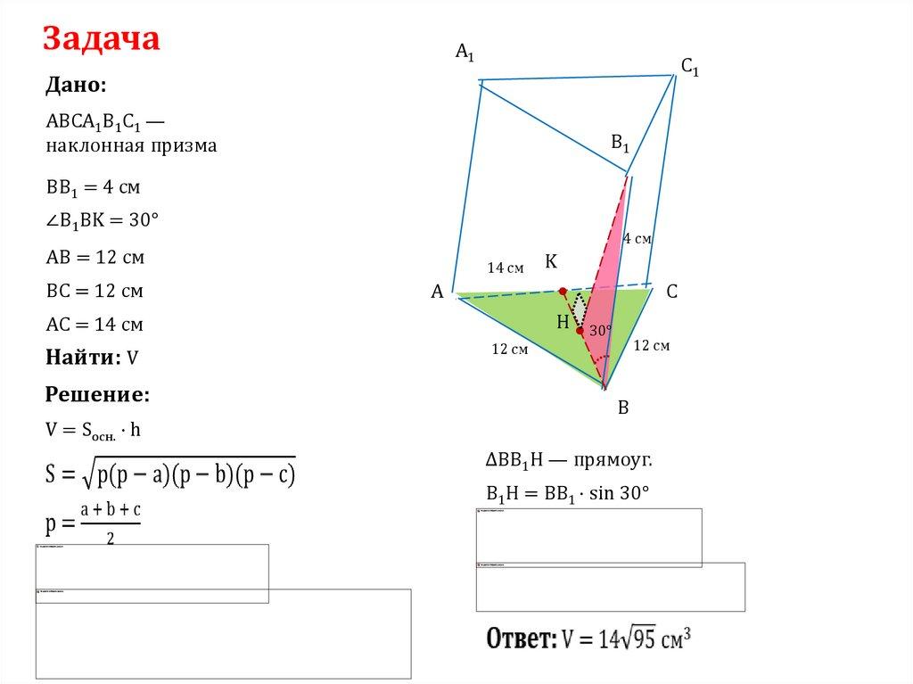 V= SАВС* h , Sосн.=√р(р-а)(р-b)(р-с) - формула Герона