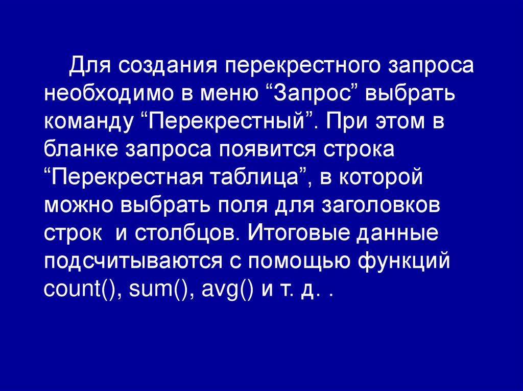 Для создания перекрестного запросанеобходимо в меню “Запрос” выбрать