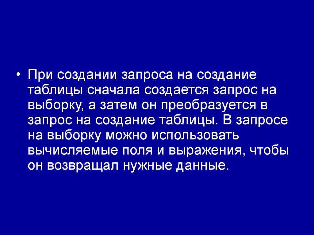 • Запрос на создание таблицы получаетданные из одной или нескольких таблиц,