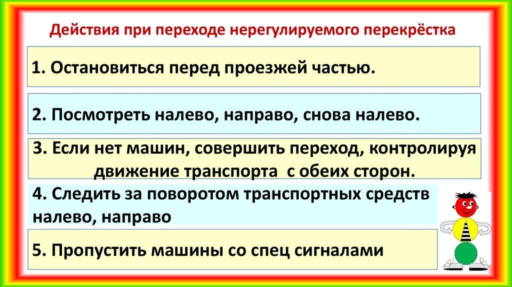 Действия при переходе нерегулируемого перекрёстка1. Остановиться перед проезжей частью.