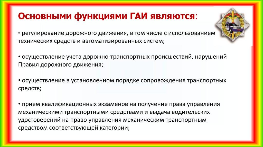 Основными функциями ГАИ являются:• регулирование дорожного движения, в том числе с использованием