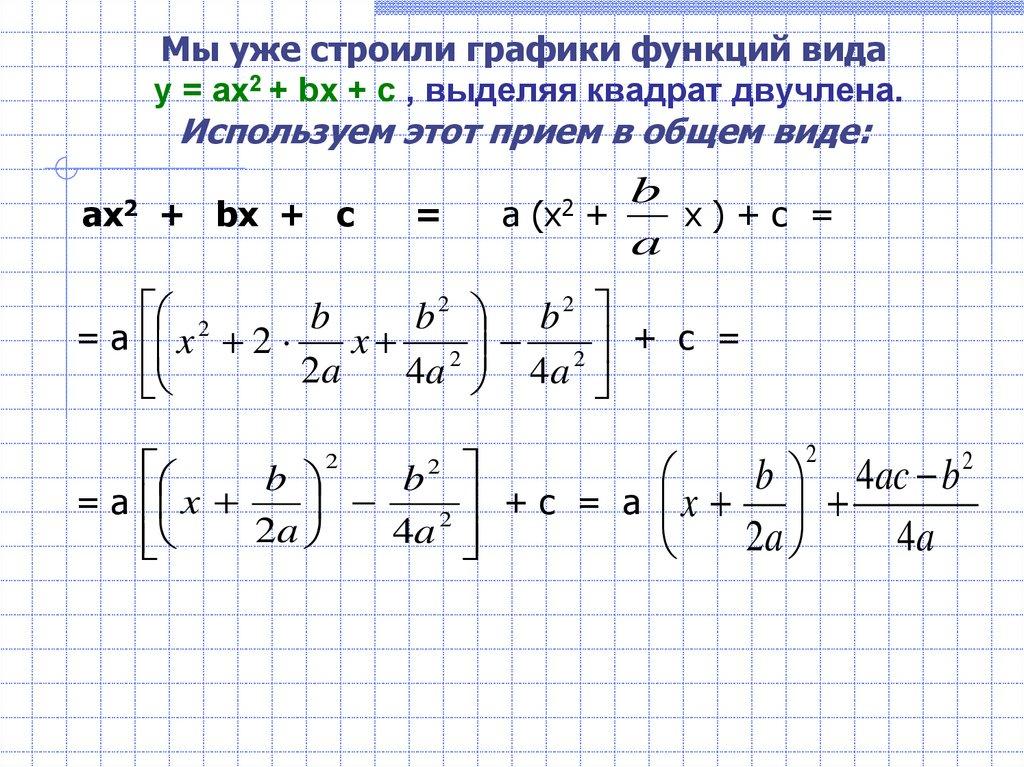 Мы уже строили графики функций видау = ах2 + bх + с , выделяя квадрат двучлена.