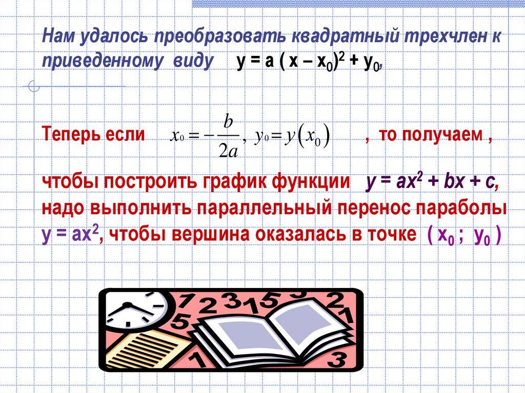Нам удалось преобразовать квадратный трехчлен кприведенному виду у = а ( х – x0)2 + y0,