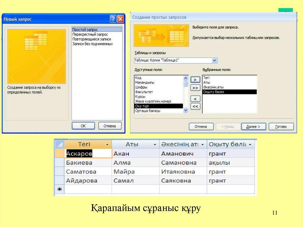 • Сұраныс (запрос) – керекті мәліметтерді бір немесе