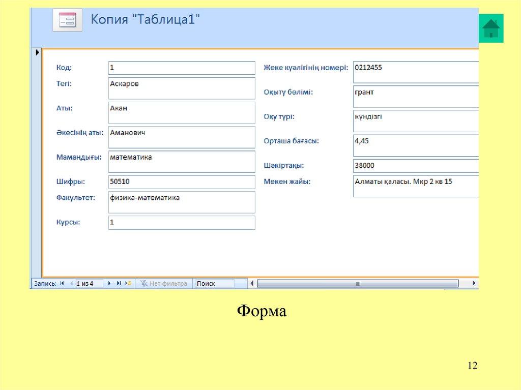 • Форма – кесте мәліметтерін экранда бейнелеу жолы